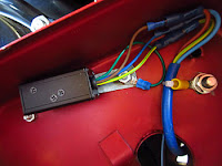 Flying leads come from the box. To ensure the system can be reverted to standard simply and quickly. The unit is mounted in the right hand tool box. The wires come in and connect to the unit’s flying leads via crimps. I decided against a separate fuse. Any failure of a semiconductor cannot cause a short circuit. A ring connector is used on the Earth lead.