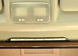 The van is generally very bright inside with the lights on, but the cab area is unlit. There is the usual cablight in the middle but, annoyingly, this switches off after the ignition has been off for a few minutes. So finding stuff in the front glove compartments ot the many cubby holes involved a torch! Primitive. So I have added some extra LEDs in the front area. I simply connected them in parallel with the front driver side spotlight so they switch on with this spot. Current is 0.3A. It looks really nice when on too, illuminating the curtain in the front.