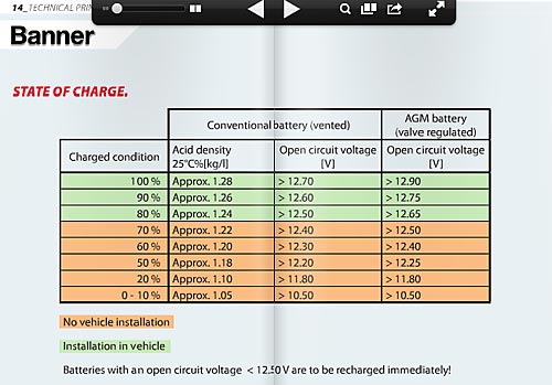 But, to avoid mishaps I have just ordered a 2 wire 4 digit digital voltmeter which I will install, connected through a push button switch to keep an eye on it. Everything gets switched off at night (apart from the fridge reignited) so in the morning the battery will have stood with minimal load (80mA) for around 8 hours so this table from Banner should give a reasonable idea of the state of the battery.
