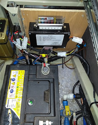 The mod was implemented using terminal strip fixed to the struts under the seat (where the leisure battery and PDU are located) and scotchlok connectors to tap into the wiring. The schottky diodes were mounted on the terminal strip.