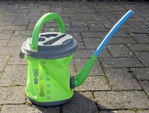 We bought six 5 litre bottles of still water for around £2 each from Tesco. We didn’t really want the water – it was the bottles. We now head off with a “spare” 30 litres of water stored under a seat. This is enough for around a week. If we are away longer, filling up now means either the hose, (which we can hardly ever find a tap to connect in the UK) or filling up the bottles and emptying them into the tank. The only extra was a flexible funnel to fit the fresh water inlet.